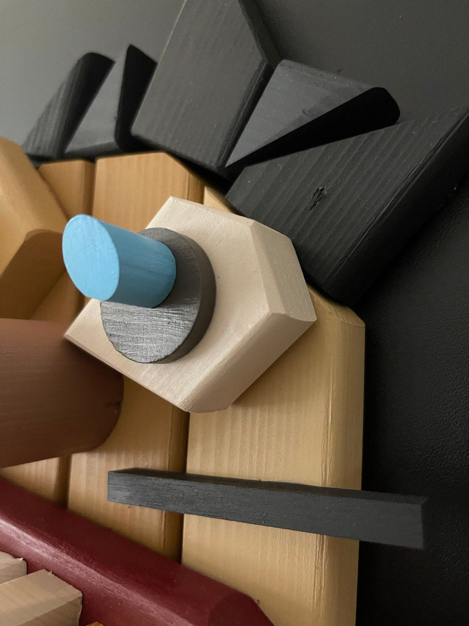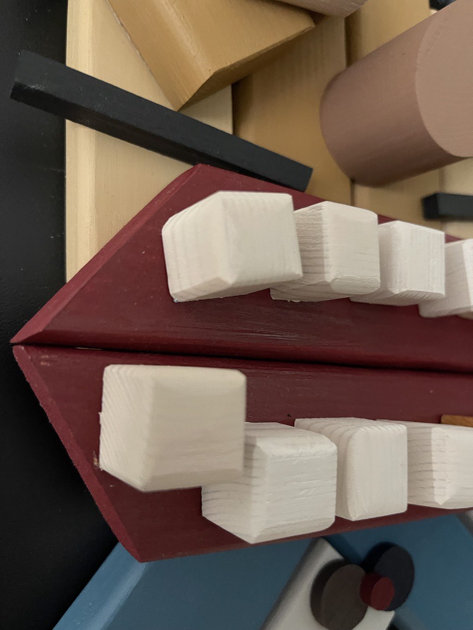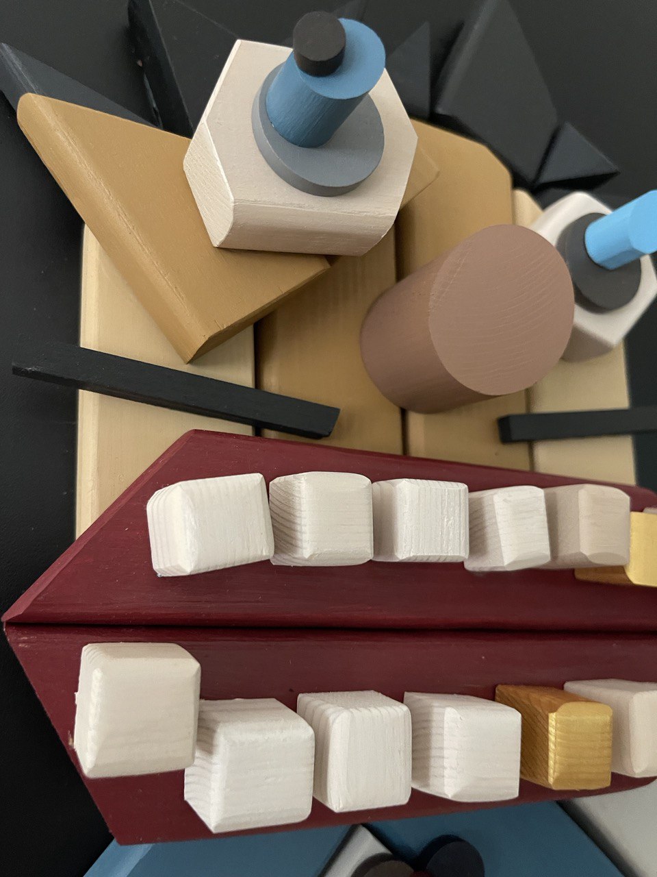 Material: wooden shapes, acrylic paint, Black Melamine Plywood.